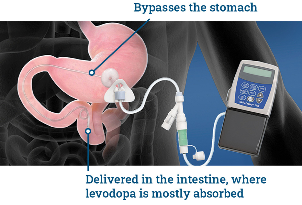 The gel is administered throughout the waking day (15 to 16 hours) via the pump connected in the morning and disconnected in the evening at bedtime.